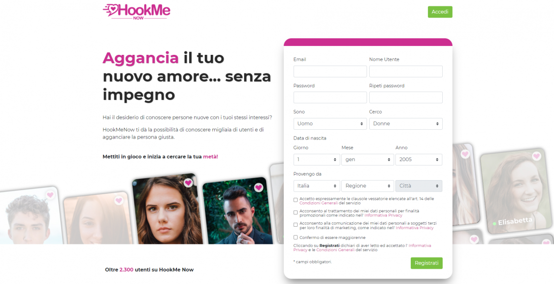 È molto semplice e immediato entrare a far parte della community di HookMeNow: con pochissimi dati da inserire all’interno del form predeterminato sarà possibile iniziare ad usufruire gratuitamente del servizio. Come già anticipato in precedenza non serviranno nome e cognome: si tratta quindi di un servizio che rimarrà totalmente anonimo, previa l’utilizzo di un nickname scelto dall’utente in fase di registrazione. E inoltre il numero di cellulare non sarà divulgato agli altri utenti.